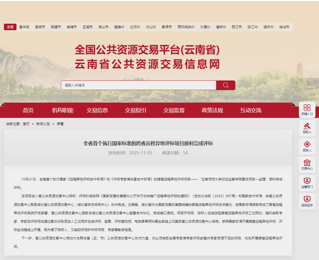 2025年10月31日,“云南師范大學(xué)紀(jì)檢監(jiān)察學(xué)院建設(shè)項(xiàng)目—監(jiān)理”評標(biāo)工作圓滿完成。此項(xiàng)目不僅是云南省公共資源交易領(lǐng)域的重要里程碑,更標(biāo)志著全省首個嚴(yán)格依據(jù)國家《遠(yuǎn)程異地評標(biāo)技術(shù)標(biāo)準(zhǔn)》與《評標(biāo)專家?guī)旃蚕砑夹g(shù)標(biāo)準(zhǔn)》實(shí)施的跨省遠(yuǎn)程異地評標(biāo)項(xiàng)目正式落地。作為該項(xiàng)目招標(biāo)代理機(jī)構(gòu),云南中咨海外咨詢有限公司以專業(yè)實(shí)力與創(chuàng)新精神,助力云南公共資源交易邁入標(biāo)準(zhǔn)化、協(xié)同化、數(shù)字化的新階段。